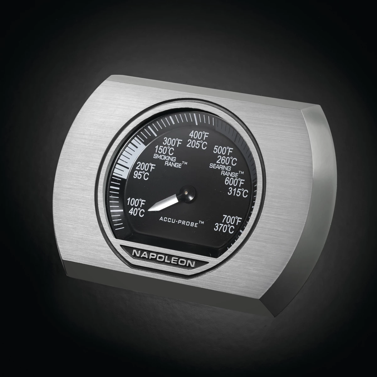 Das mehr als verlässliche ACCU PROBE Thermometer von Napoleon ist im Deckel eingelassen und zeigt die Innenraumtemperatur des Gasgrills an.